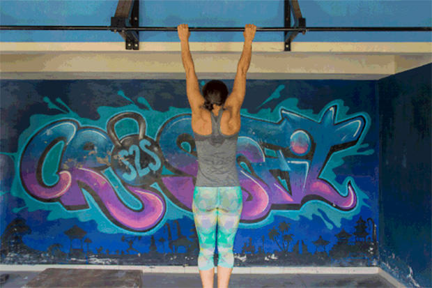 HOW TO DO IT: Start by hanging on the pull-up bar with your hands facing away from your body. Engage your core and lats as you pull your lats down your back and away from your ears, creating space between the shoulders and ears.