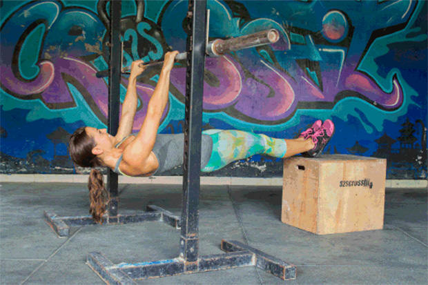 HOW TO DO IT: Place your body underneath the bar and place your feet on a bench (or get a buddy to hold your feet). Keeping your body in a straight line, with abs and glutes engaged, pull your chest toward the bar as you squeeze your lats together. By placing your feet on a bench, your body should be parallel to the floor. If this is too difficult, use a small box or mat so that you’re not fully parallel to the floor.